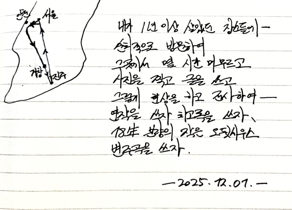 칼바람 불어닥치는 영하의 서울 도심을 뚫고—나는 대합실에서 열차를 기다리며, 대학 글쓰기 교재를 읽었다. 긴장이 되지 않나? 모르겠다. 연습하지 않은 내일의 공연과 대학글쓰기, 수학 시험 모두. 아뭏든 열차는 일곱시 삼십분에 순천역에 닿을 것이고 나는 택시나 버스 같은 걸 타고 횟집에 가서 샌드페블즈 14대2 선배님께서 사 주시는 회를 먹을 것이다.